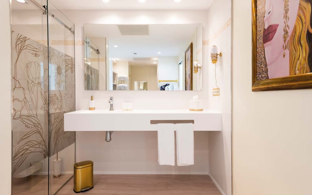 Our elegant Royal Deluxe is very spacious with 40m2 and capacity for 3 people, has a private terrace with side sea view, outdoor jacuzzi, sunbeds and bali bed. It is ideal to have a rest and enjoy your best holidays.